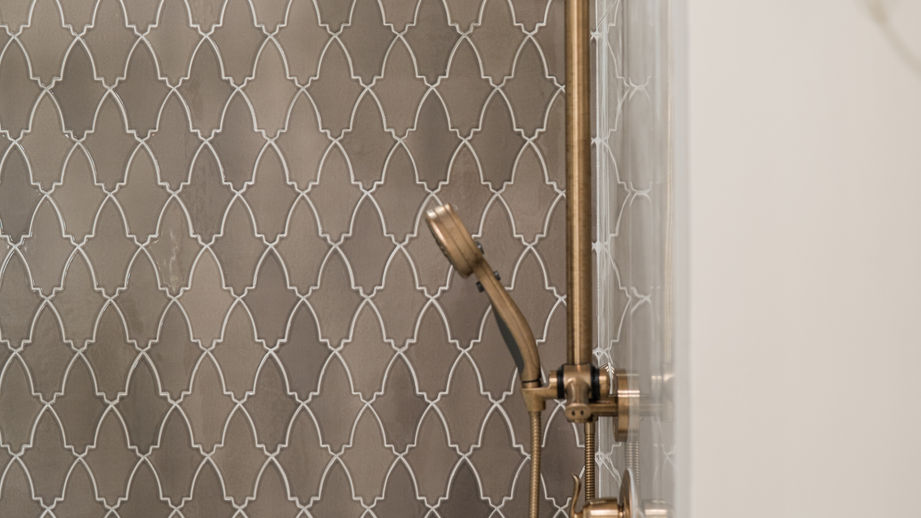 Bathroom 1 we opted for Italian imported porcelain tile on the floors and side walls of the shower, with a handmade custom tile with a beautiful scalloped design that became the feature of the bathroom.